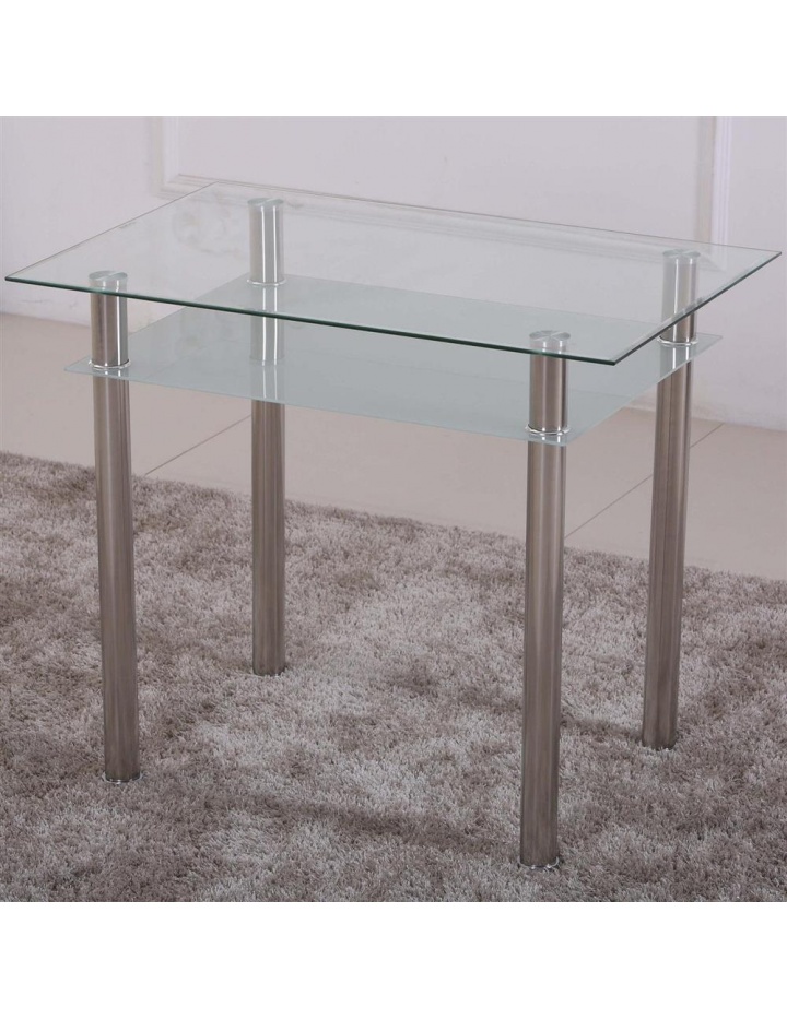 Moderner, kompakter Esstisch in Klarglas mit sandierte Ablage