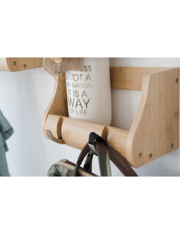 Der Artikel ist aus massivem Bambus gefertigt. Er hat 2 Metall Haken zum ausklappen an denen Kleidung, Accessoires, Handtücher etc. aufgehangen werden können. Zusätzlich bietet diese Garderobenleiste noch eine Ablagemöglichkeit für mehr Stauraum. Egal ob für Geschäft - Büro oder für ihr eigenes Heim, die Garderobenleiste schafft Ordnung. Die Garderobenleiste ist in natur farbig. Wir verwenden ausschließlich Lacke auf wässriger Basis die den Anforderungen von Lacken für Kindermöbel ( DIN EN 71-3 ) entsprechen. Wir haben uns bewusst für den Rohstoff Bambus entschieden. Bambus gilt als einer der am schnellsten nachwachsenden Rohstoffe dieser Erde. Bambus kann schon nach ca. 3 Jahren das erste Mal geerntet werden. Im Gegensatz zu jungen Bäumen aus angelegten Plantagen und majestätischen Riesen aus Urwäldern, stirbt Bambus nach dem fällen nicht ab, sondern regeneriert sich selber. Zudem ist Bambus härter als Eiche, Buche, Ahorn oder Birke um nur ein paar Beispiele zu nennen. Über viele Jahre hinweg kann dieser unglaubliche Rohstoff geerntet werden und zu ganz besonders umweltfreundlichen Möbeln verarbeitet werden. Selbst die bei der Produktion anfallenden Abfälle aus Bambus werden wiederverwertet. Unser Bambus ist selbstverständlich FSC zertifiziert. Eine Entscheidung für ein Möbel aus Bambus ist auch eine Entscheidung für unsere Umwelt. Technische Daten: Breite: ca. 25,2 cm Tiefe: ca. 13,5 cm Netto Gewicht ca. 2 KG