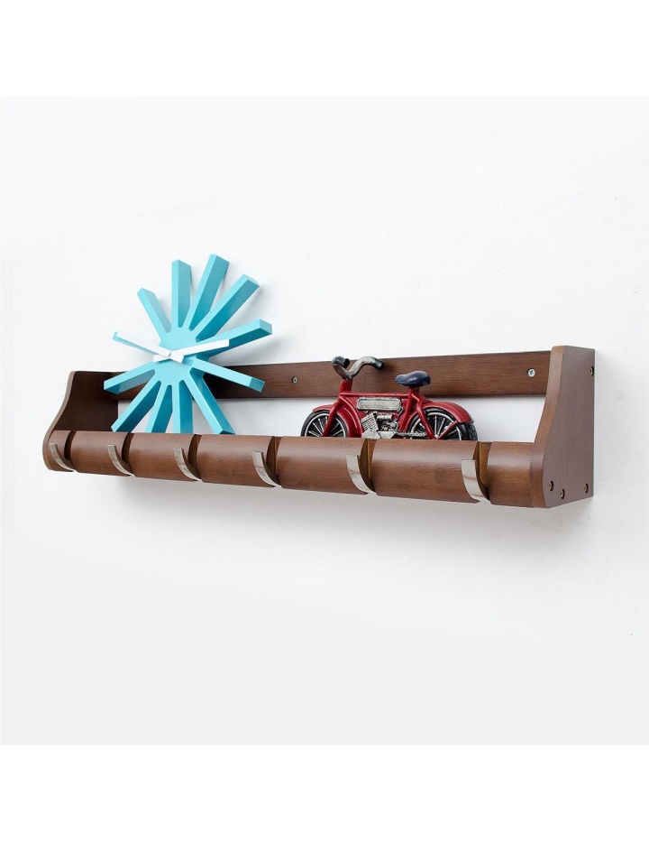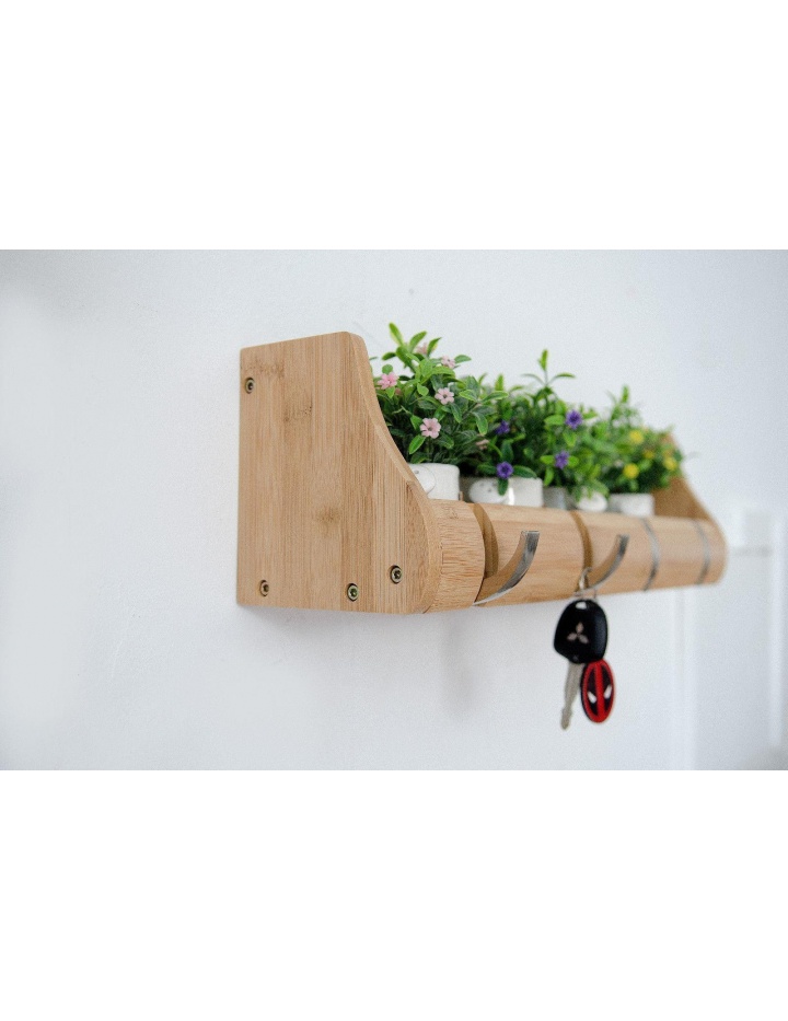 Der Artikel ist aus massivem Bambus gefertigt. Er hat 6 Metall Haken zum ausklappen an denen Kleidung, Accessoires, Handtücher etc. aufgehangen werden können. Zusätzlich bietet diese Garderobenleiste noch eine Ablagemöglichkeit für mehr Stauraum. Egal ob für Geschäft - Büro oder für ihr eigenes Heim, die Garderobenleiste schafft Ordnung. Die Garderobenleiste ist Espresso farbig lackiert. Wir verwenden ausschließlich Lacke auf wässriger Basis die den Anforderungen von Lacken für Kindermöbel ( DIN EN 71-3 ) entsprechen. Wir haben uns bewusst für den Rohstoff Bambus entschieden. Bambus gilt als einer der am schnellsten nachwachsenden Rohstoffe dieser Erde. Bambus kann schon nach ca. 3 Jahren das erste Mal geerntet werden. Im Gegensatz zu jungen Bäumen aus angelegten Plantagen und majestätischen Riesen aus Urwäldern, stirbt Bambus nach dem fällen nicht ab, sondern regeneriert sich selber. Zudem ist Bambus härter als Eiche, Buche, Ahorn oder Birke um nur ein paar Beispiele zu nennen. Über viele Jahre hinweg kann dieser unglaubliche Rohstoff geerntet werden und zu ganz besonders umweltfreundlichen Möbeln verarbeitet werden. Selbst die bei der Produktion anfallenden Abfälle aus Bambus werden wiederverwertet. Unser Bambus ist selbstverständlich FSC zertifiziert.