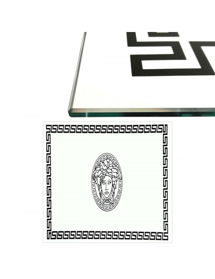 Die Glasplatte besteht aus ESG Sicherheitsglas aus Klarglas mit schwarzen Verzierungen. Die Stärke beträgt 6mm. Die Kanten sind poliert und wurden mit Facettenschliff veredelt. Die Glasplatte eignet sich Ideal als Glasbodenplatte für z.B. Kamin, Funkenschutzplatte, Tischplatte usw.