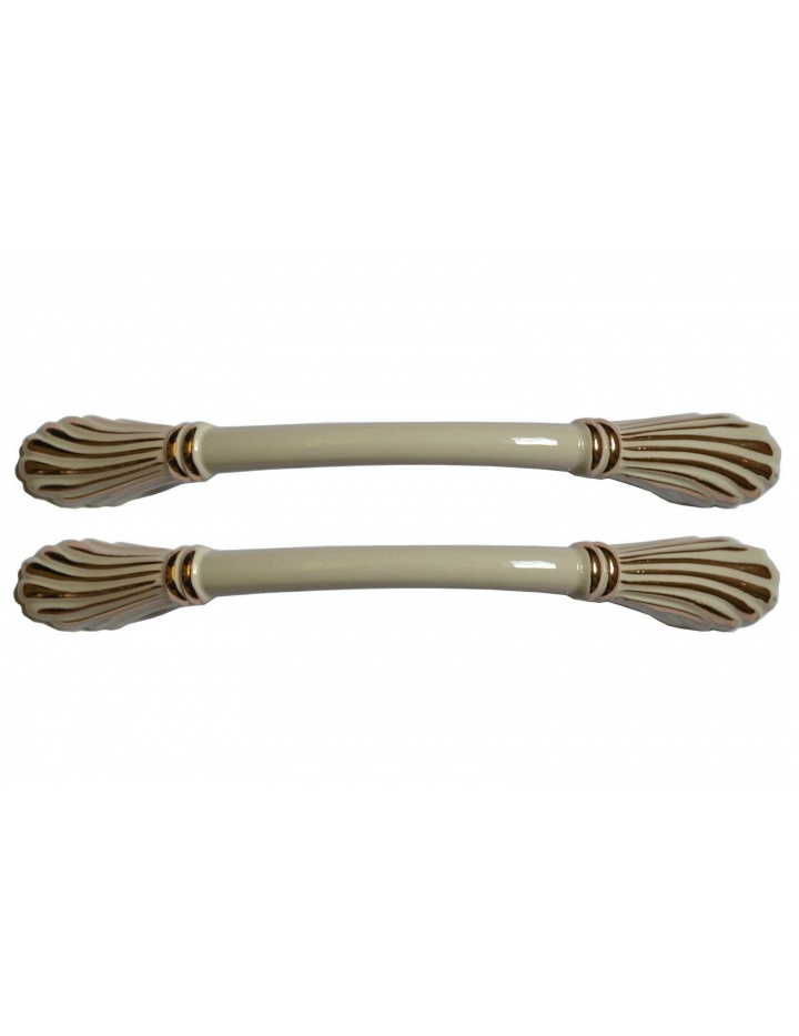 2x Möbelgriffe aus Metall, weiß mit goldfarbenem Dekor