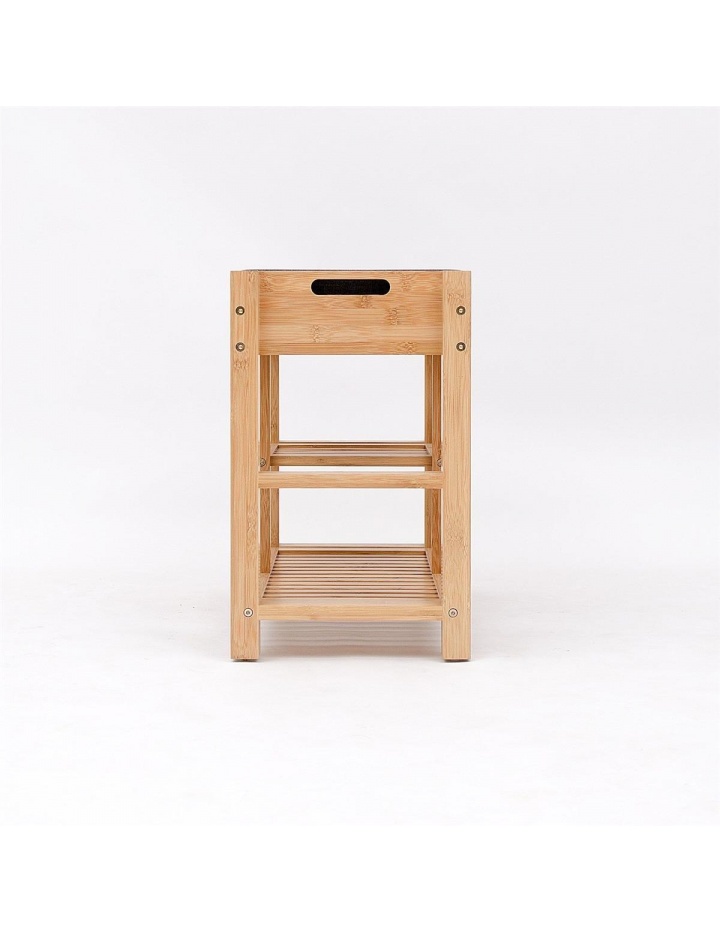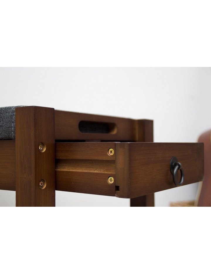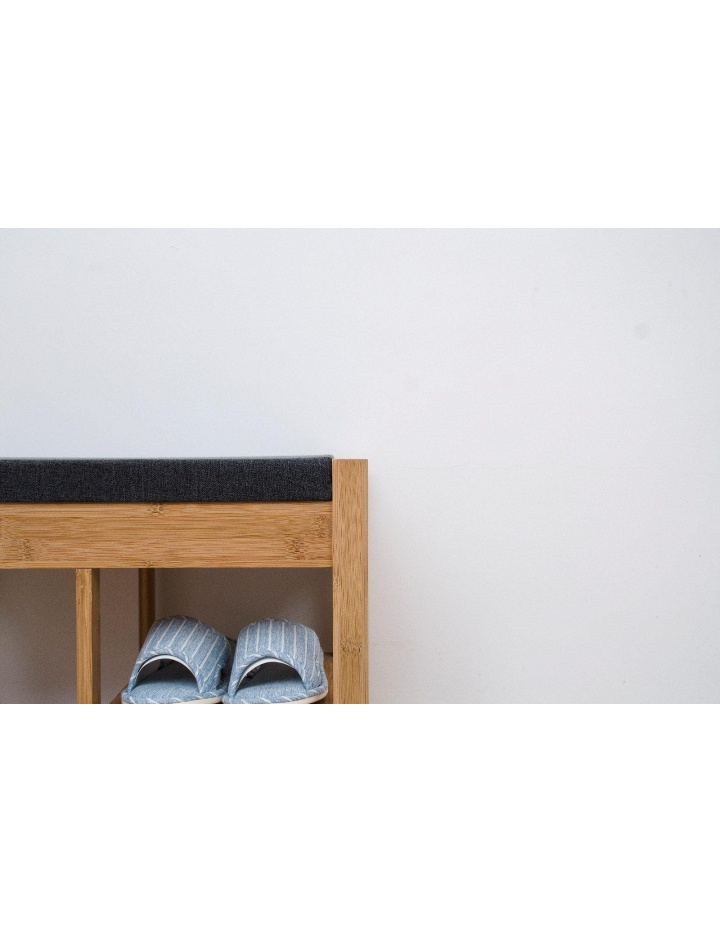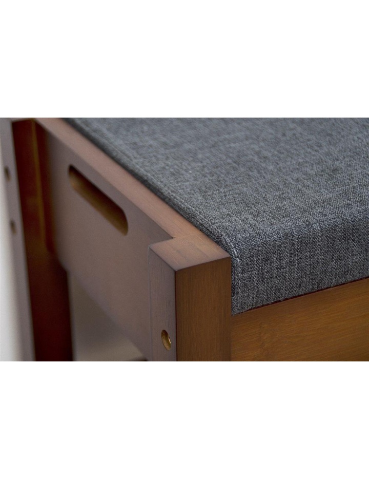 Die Sitzbank ist aus massivem Bambus gefertigt. Unter der Sitzfläche verbirgt sich ein seitlicher Schubkasten zur Aufnahme von Kleinteilen. Abgerundet wird die Sitzbank durch ein schickes Sitzkissen. Der Rahmen ist in Espresso farbig lackiert. Wir verwenden ausschließlich Lacke auf wässriger Basis die den Anforderungen von Lacken für Kindermöbel ( DIN EN 71-3 ) entsprechen.