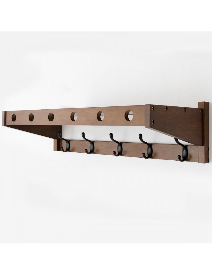 Moderne Wandgarderobe mit 5 Metall Doppelkleiderhaken und oberen Ablageboden ( Hutablage ) sowie 6 Bohrungen zur Aufnahme von Kleiderbügeln in der vorderen Leiste. Die Wandgarderobe ist aus massivem Bambus gefertigt. Der Rahmen ist Espresso farbig lackiert. Die Kleider Doppelhaken sind in der Farbe schwarz gehalten. Wir verwenden ausschließlich Lacke auf wässriger Basis die den Anforderungen von Lacken für Kindermöbel ( DIN EN 71-3 ) entsprechen.