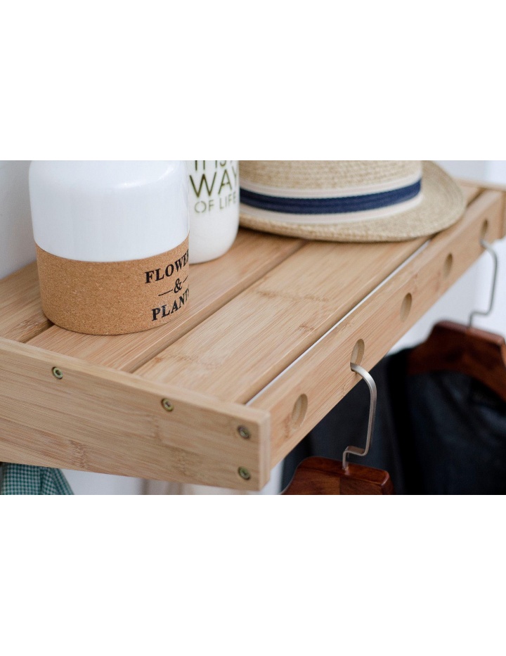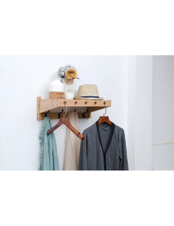 Moderne Wandgarderobe mit 6 Metall Doppelkleiderhaken und oberen Ablageboden ( Hutablage ) sowie 7 Bohrungen zur Aufnahme von Kleiderbügeln in der vorderen Leiste. Die Wandgarderobe ist aus massivem Bambus gefertigt. Der Rahmen ist Espresso farbig lackiert. Die Kleider Doppelhaken sind in der Farbe schwarz gehalten. Wir verwenden ausschließlich Lacke auf wässriger Basis die den Anforderungen von Lacken für Kindermöbel ( DIN EN 71-3 ) entsprechen.