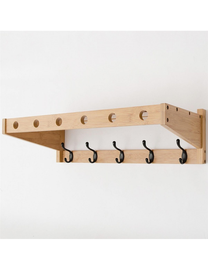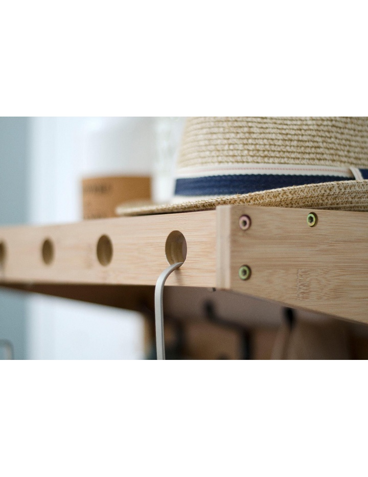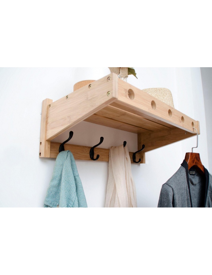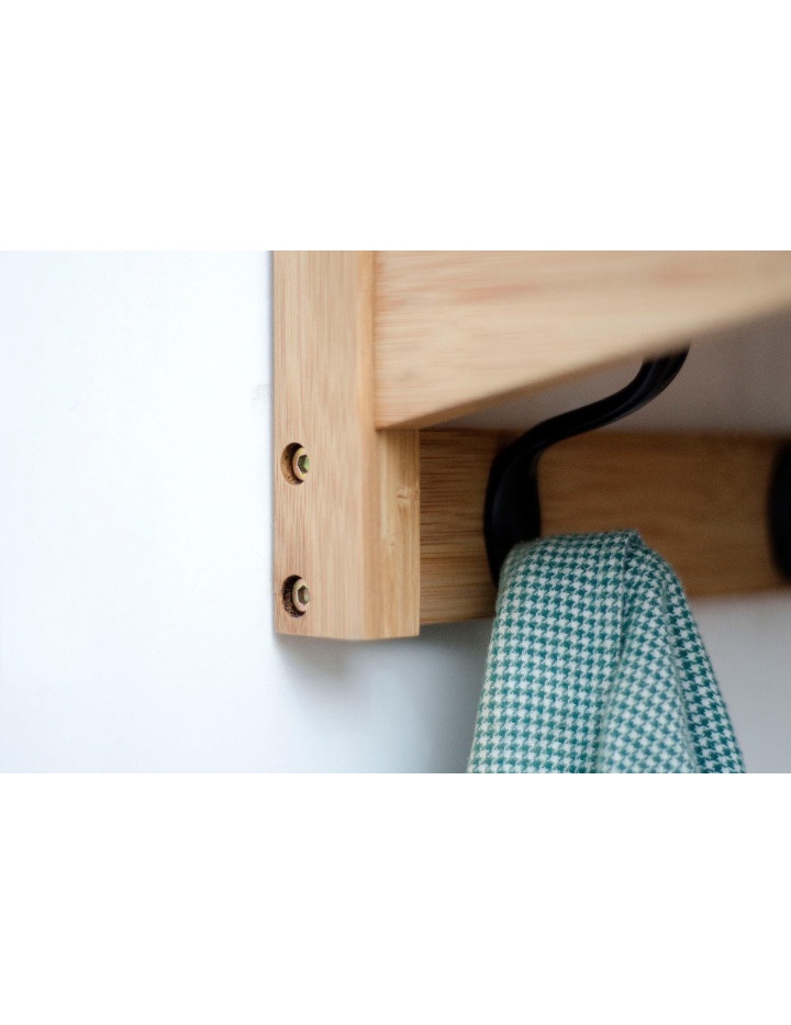 Moderne Wandgarderobe mit 5 Metall Doppelkleiderhaken und oberen Ablageboden ( Hutablage ) sowie 6 Bohrungen zur Aufnahme von Kleiderbügeln in der vorderen Leiste. Die Wandgarderobe ist aus massivem Bambus gefertigt. Der Rahmen ist natur farbig lackiert.